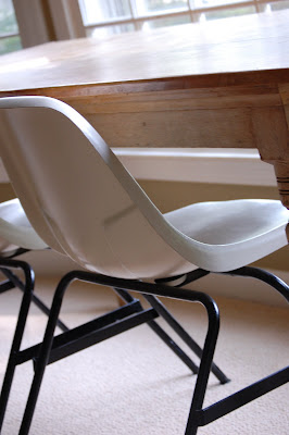 I took them apart, sanded down the legs and spray painted them black. I cleaned up the seats and used a fiberglass spray paint on them and ooh la la they are so pretty now! So clean and fresh, and I love the pop of white they add.